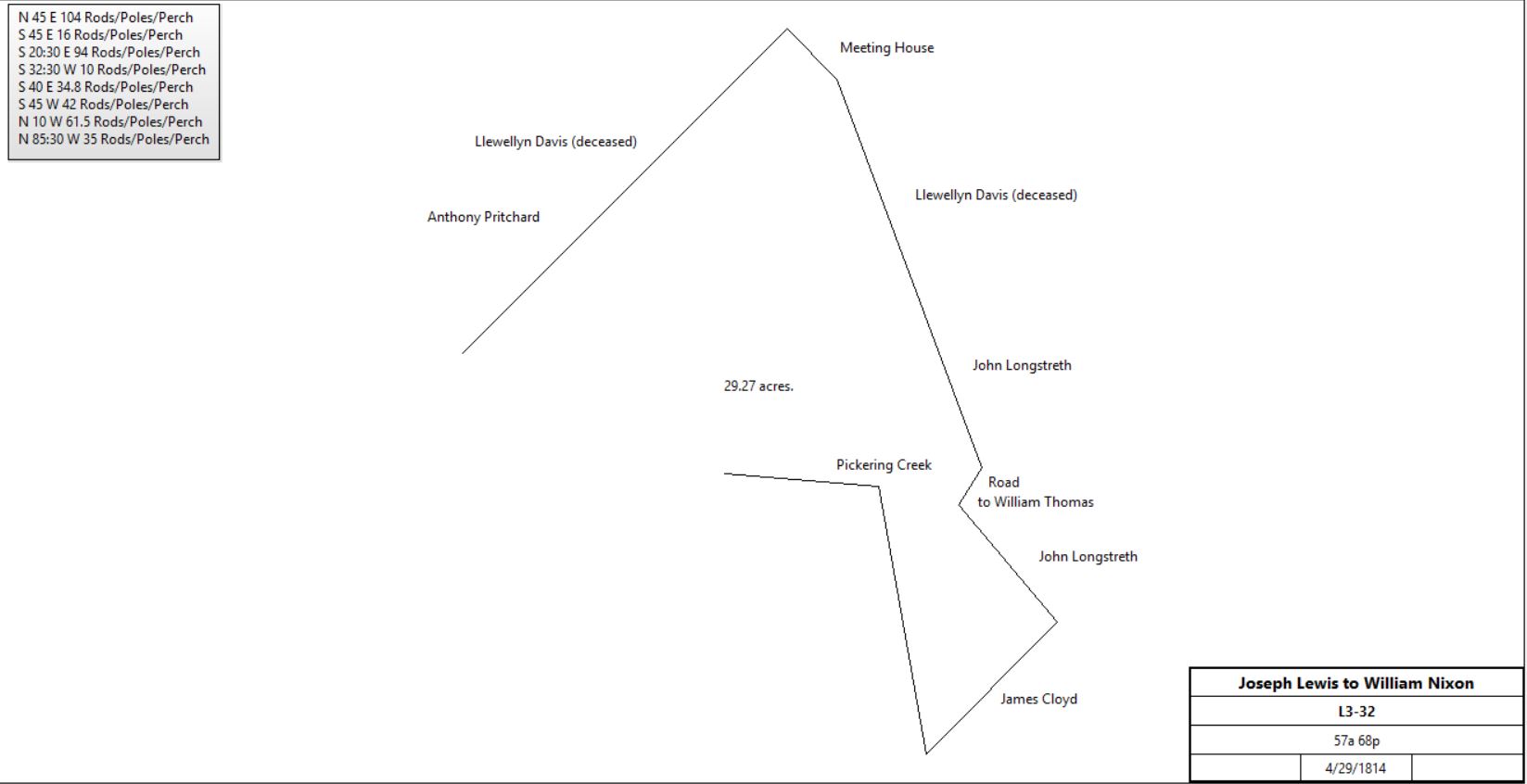 William and Samuel Nixon and familiesSamuel and Susannah Nixon (aka Nixson) lived in Richland, Bucks county. Between 1770 and 1792 they had 10 children. Among them were William, b. 1775, and Samuel, b. 17851. On the 2nd January 1800, Martha Roberts, daughter of Edward Roberts married William Nixon at Richland meeting, Bucks County1. Samuel Nixon married Peninah Roberts around 1809 in Richland2. William and Samuel Nixon do not appear in the Chester county 1810 tax returns, but Samuel and Peninnah Nixon have a daughter Henrietta in Uwchlan on the 14th February 18103. In 1812 Samuel Nixon (physician) and William Nixon (miller) purchased a tract of 10 acres in Charlestown4. William & Martha Nixon had a daughter, Susanna, on the 11th June 1812 in Uwchlan3. Samuel and Penninah had a daughter, Mary Ann, on 25th January 1812, who died in 18132. In 1813 William sells his portion of the 10 acre tract to Samuel5. Samuel Nixon appears in the Richland 1812 and 1813 tax returns as a non-resident owning tracts of 2 and 4 acres6. On the 29th April 1814 William Nixon purchased a tract of 57 acres on Pickering Creek, in Charlestown, including Grist and Saw mills7. In the 1814 tax returns, Samuel is shown as having 30 + 16 acres with buildings and half a carding machine. William is shown as having 52 acres with Grist and Saw mills and half a carding machine. In 1817 Samuel (physician) and Peninnah Nixon sell 2 tracts in Charlestown of 10 and 5 acres to William Nixon (yeoman)8. Samuel then looses a tract of 68 acres in a Sheriff's sale9. The deed for the purchase of this tract has not been found. 25th January 1818 Samuel and Peninnah Nixon have a daughter Mary Ann3. In 1820 Samuel Nixon looses 2 tracts of 10 acres and 30 acres in a Sheriff's sale10. The 30 acre tract was later purchased by John Williams (wife Sarah nee Roberts) in 1839. The 1820 tax returns shows Dr. Samuel Nixon as an inmate (i.e. married but owning no land) and William Nixon as owning 69 acres and a Grist mill11. In 1822 William looses the 57 acres tract in a Sheriff's sale12. When Edward Roberts died in 1823 he bequeathed his household goods to his daughter Martha and her husband William Nixon. He also bequeathed money to their children, which he listed. In 1824 William & Martha Nixon sell a tract of 5 acres13. There are no Nixons in the Chester county 1824 tax returns. Penninah Nixon died in Chester County. It is unclear when the Nixons left Chester County, but it is likely that they left with outstanding debts. In his will, written in 1824 and proved in 1836, John Roberts gives a bequest to Martha Nixon and to the children of Samuel & Peninnah Nixon, noting that Peninnah had died. Samuel and William Nixon lived in Wayne, Indiana in 1850 (census). Samuel had a wife Barbary and children. They had previously lived in Ohio. William and Martha also had children living with them and born in Pennsylvania. | ||||||||||||||||||||||||||||||||||||||||||||||||||||||||||||||||||||||||||||||||||||||||||||||||||||||||||||||||||||||||||||||